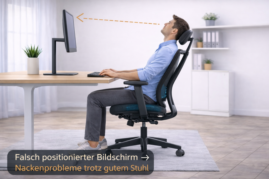 falsch positionierter Bildschirm → Nackenprobleme trotz gutem Stuhl