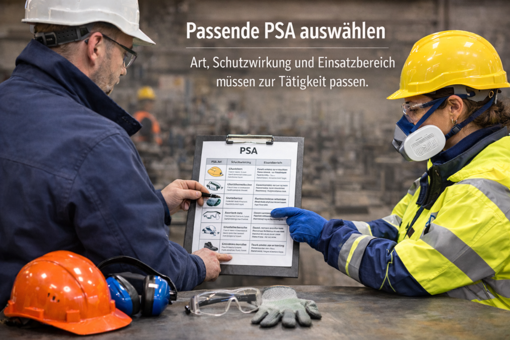 Die Auswahl der persönlichen Schutzausrüstung (PSA) erfolgt auf Grundlage der Gefährdungsbeurteilung, in der die möglichen Gefährdungen am Arbeitsplatz ermittelt und bewertet werden. Dabei werden Art, Ausmaß und Dauer der Gefährdung berücksichtigt, um eine geeignete PSA festzulegen. Ziel ist es, den bestmöglichen Schutz der Beschäftigten zu gewährleisten und gesundheitliche Schäden zu vermeiden.